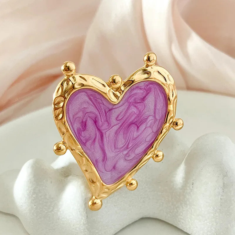 Un corazón púrpura esmaltado enmarca tu look con un brillo dorado de aire romántico. Su aro abierto es ajustable y el acabado en oro 14K con PVD sobre acero inoxidable 304 lo hace resistente para el día a día. Una pieza elegante y dulce con presencia statement.