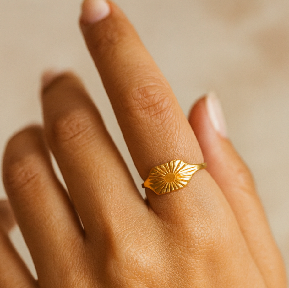 Inspirado en el poder del sol como símbolo de luz y renacimiento, este anillo en baño de oro deslumbra con un diseño grabado que irradia elegancia. Su forma abierta permite un ajuste cómodo, convirtiéndolo en una pieza versátil y luminosa para el día a día.