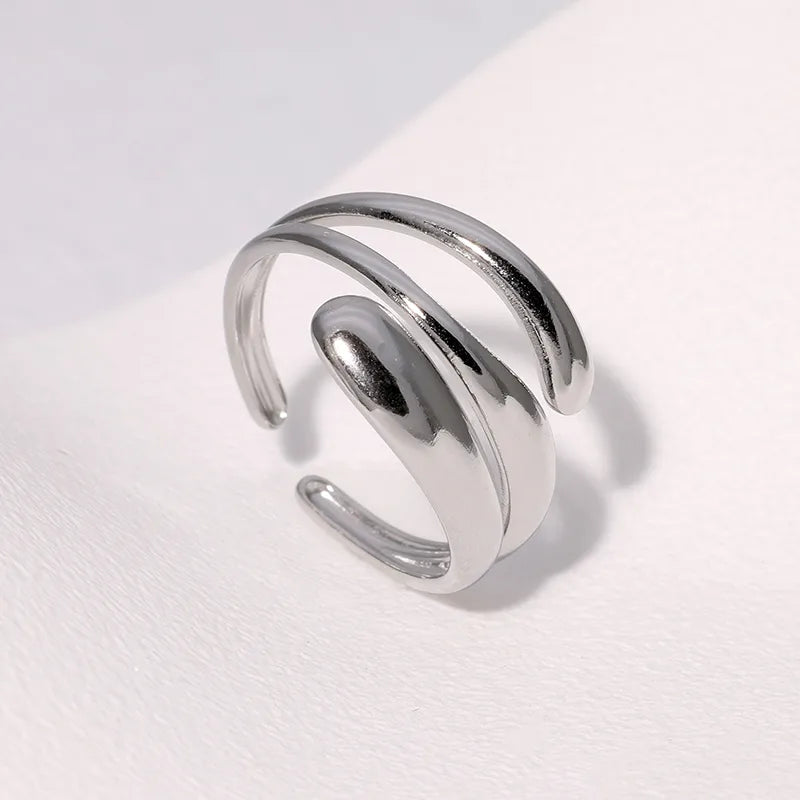 Moderno y minimalista, este anillo abierto en acero inoxidable 304 con acabado plateado realza tu look con su trazado geométrico. Su diseño ajustable abraza cómodamente el dedo y aporta un aire contemporáneo y fresco, perfecto para llevar solo o en combinación con otras piezas.