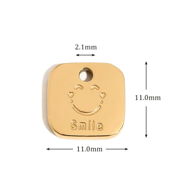 Mini placa cuadrada redondeada con carita sonriente y corazones grabados + texto Smile. Un detalle positivo para personalizar collares, pulseras o aros en tu colección Diseña tu joya.