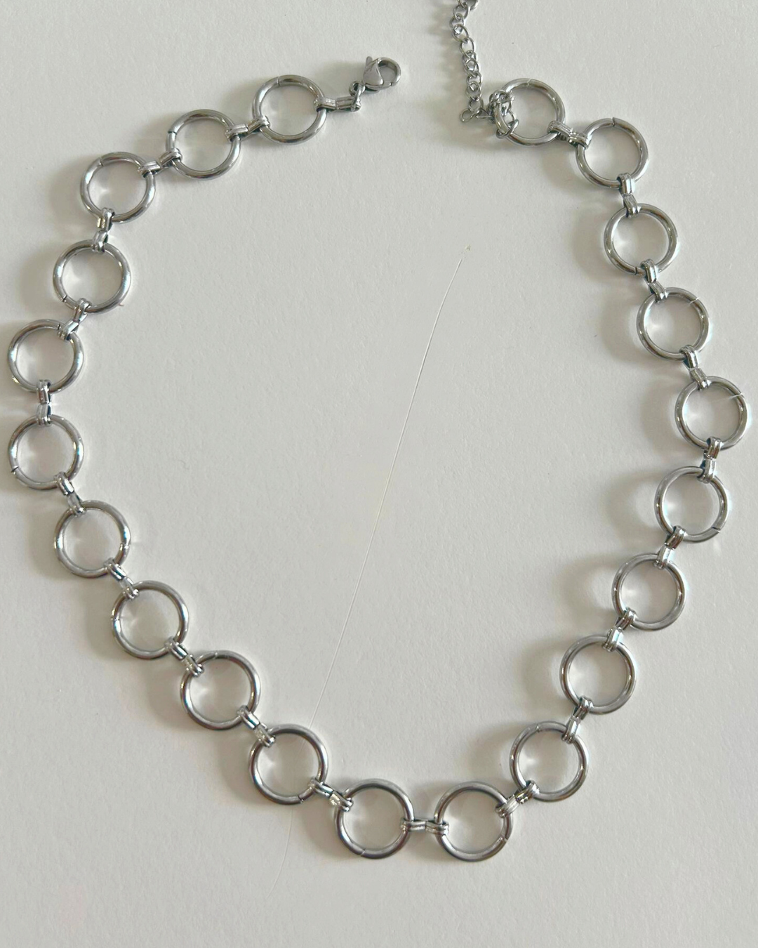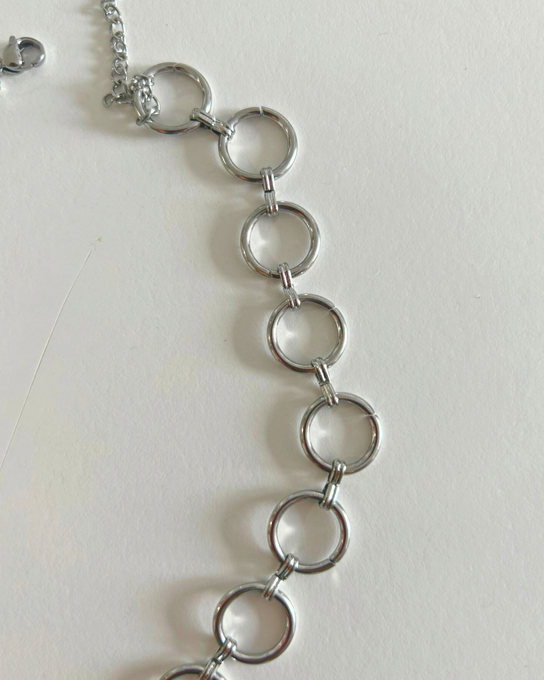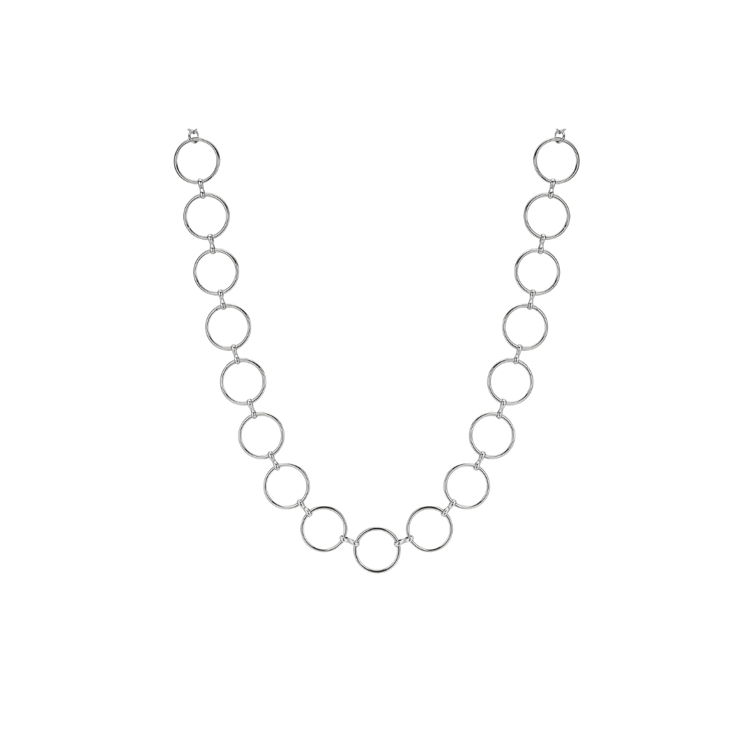 La gargantilla Cerchi explora la repetición pura de la forma circular como símbolo de continuidad y unidad. Confeccionada en acero inoxidable 304 de alto pulido, sus 20 eslabones en forma de anillo de 12 mm de diámetro se enlazan sin solución de continuidad, creando un collar de 38 cm con extensor de 5 cm (ajustable entre 38–43 cm). Con un peso de 53 g, combina una presencia marcada con la ligereza propia del acero quirúrgico, garantizando además resistencia a la corrosión e hipoalergenicidad.