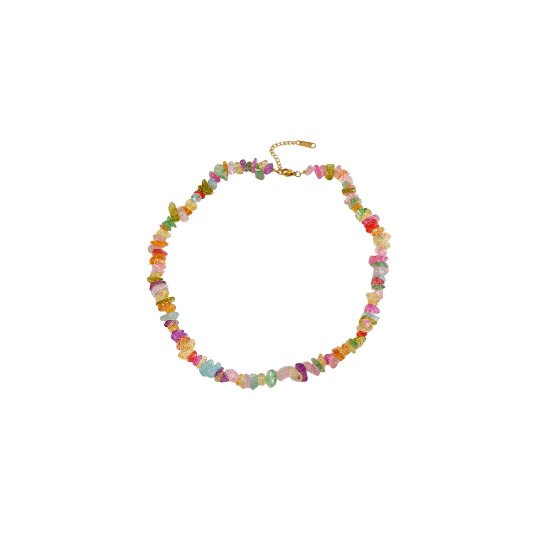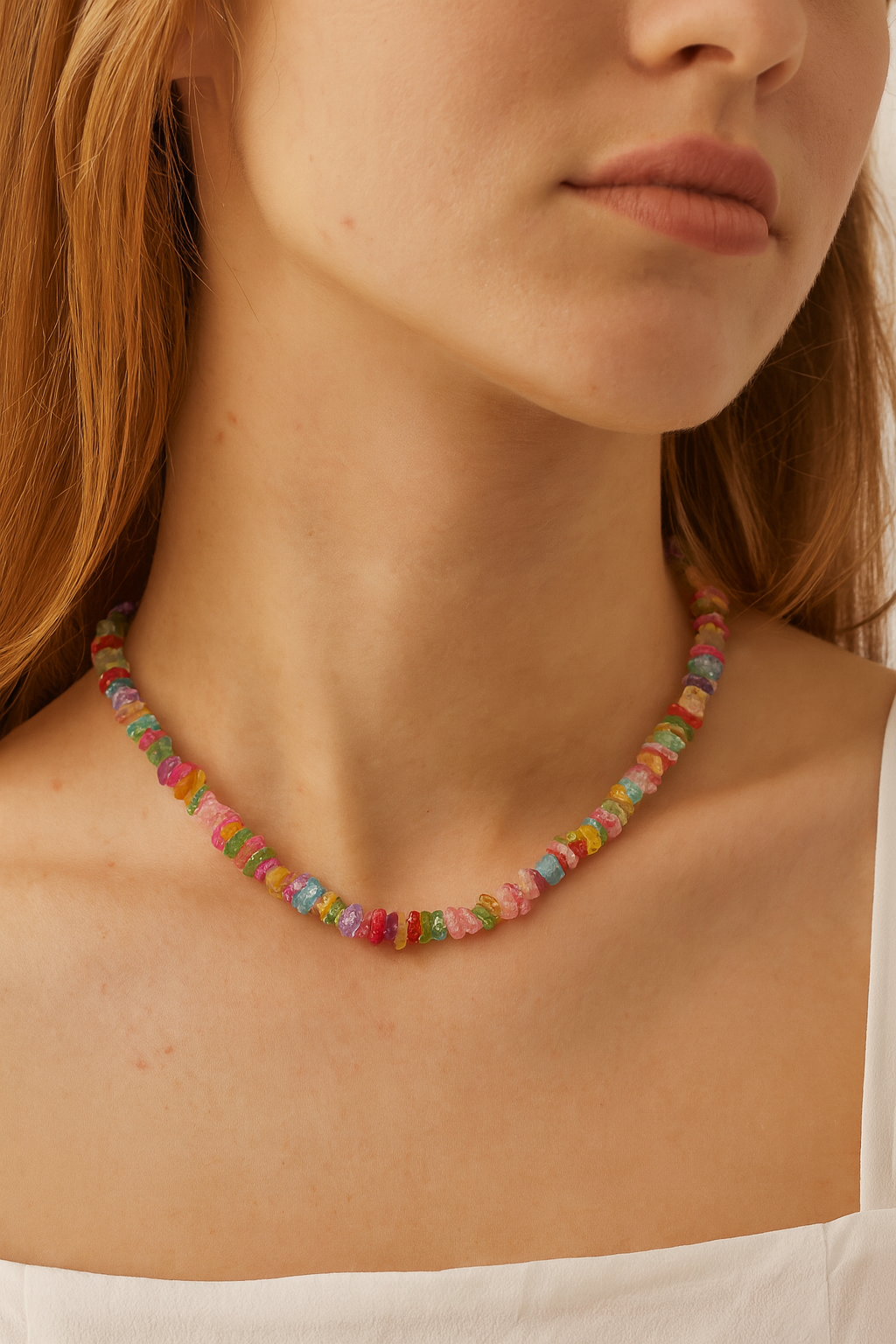 El collar “Aria di Colori” celebra la riqueza cromática de la naturaleza a través de un ensamble de piedras semipreciosas irregulares —cornalina, cuarzo rosa, amatista, peridoto y citrino— montadas sobre un hilo de acero inoxidable 316L chapado en platino de 18 k. Cada pieza, de 4 – 6 mm, se dispone en un ritmo aparentemente aleatorio que remite a las composiciones puntillistas de Seurat, creando un juego vibrante de matices que crepitan bajo la luz estival.