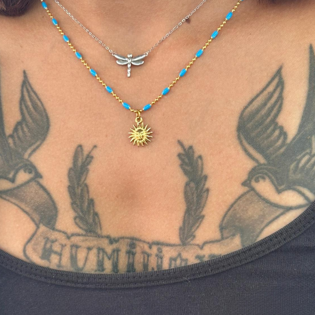 Fabricado en acero inoxidable 316L chapado en oro de 18k, este diseño combina una delicada cadena de cuentas en azul y dorado con un colgante de sol radiante, símbolo de energía, vitalidad y optimismo.