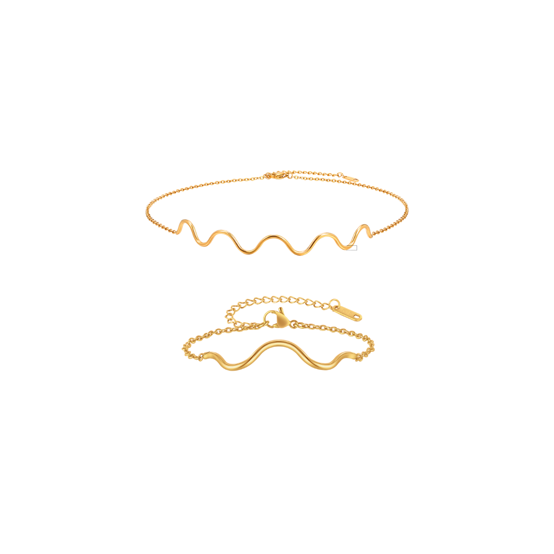 Descubre el Conjunto “Onda Dorada”, una armonía de diseño minimalista y acabado premium que combina un collar y una pulsera a juego. Ambos lucen un delicado motivo ondulado de 4 cm × 0,2 cm en acero inoxidable 304 chapado en oro de 18 k, suspendido de cadenas ajustables (collar de 32–40 cm y pulsera de 16–21 cm) para garantizar un ajuste perfecto. Con un peso ligero de 7 g el collar y 3 g la pulsera, este set aporta un sutil juego de luces y un movimiento fluido, ideal para estilismos urbanos o de noche. Llévalos juntos para un look coherente y sofisticado, o combínalos con tus otras piezas favoritas para crear capas llenas de elegancia y dinamismo.
