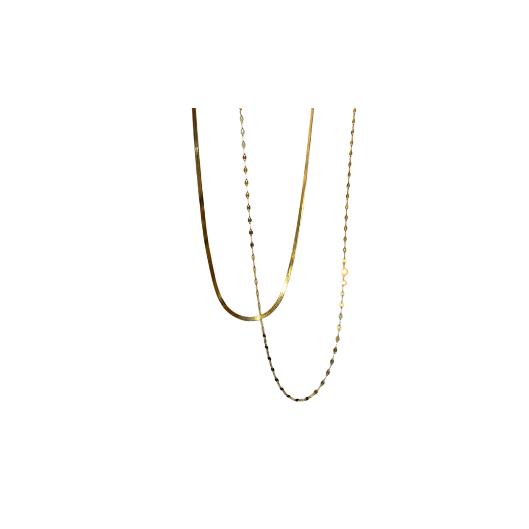 Dos cadenas, una esencia: luz. Este collar une una cadena tipo serpiente con una más fina y facetada, creando un juego de brillos elegante y moderno. Fabricado en acero inoxidable 304 con baño dorado mediante recubrimiento de iones (IP), es resistente al uso diario y mantiene su acabado intacto.