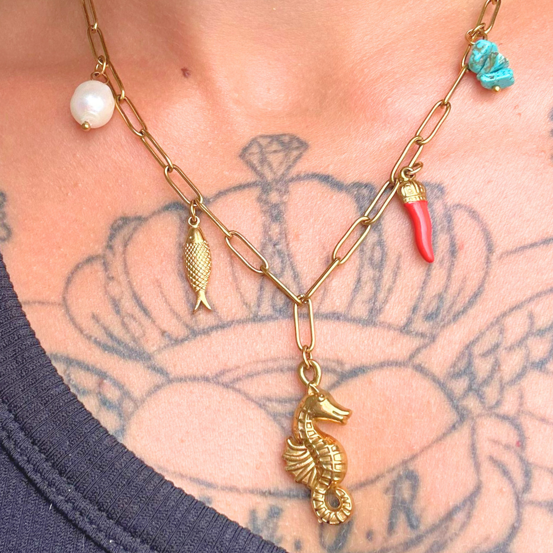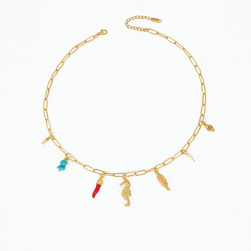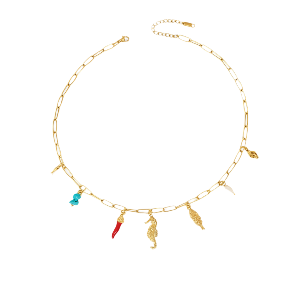 Deja que el Mediterráneo te acompañe allá donde vayas. El colgante Talismán combina una cadena tipo paper-clip bañada en oro de 18 K con siete charms que evocan la buena fortuna junto al mar: concha, caballito de mar, pez escama, cuerno de coral rojo esmaltado, gota nácar y turquesa pulida.
