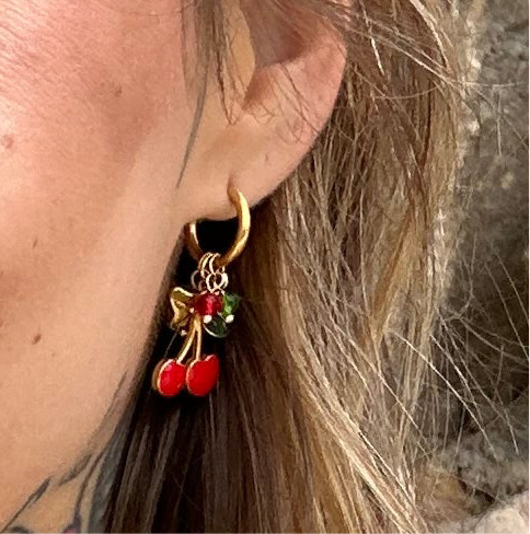 Pendientes de gota en acero de titanio con motivo veraniegos, rematados con un colgante de cereza pulida. Con solo 15 g, ofrecen un brillo resistente e hipoalergénico para llevar tanto a diario como en tus momentos de fiesta
