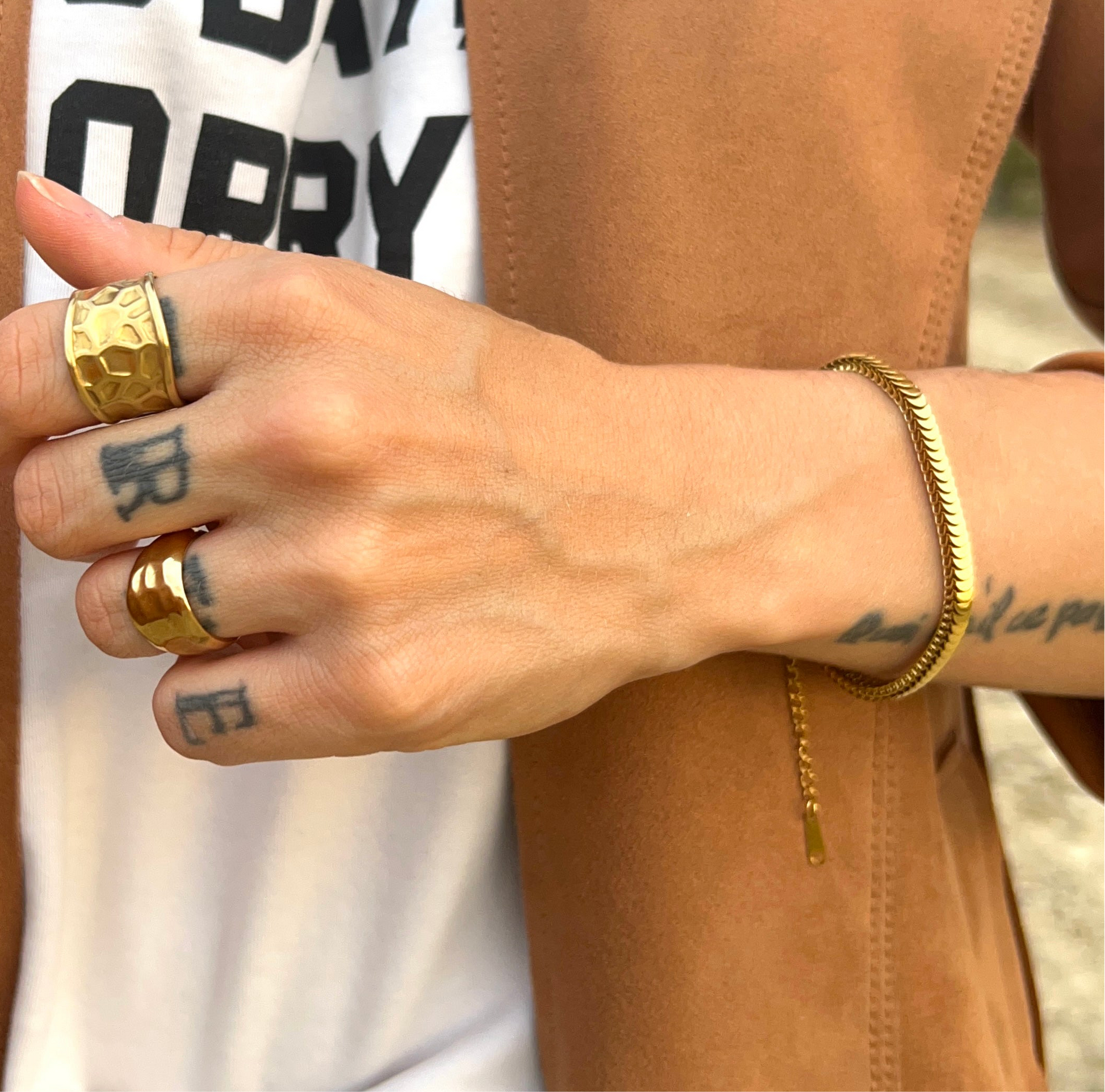 La versión dorada de nuestra Náyade aporta calidez y sofisticación. Fabricada en acero de titanio, combina diseño orgánico con resistencia para convertirse en una pieza versátil que destaca sola o en stack.