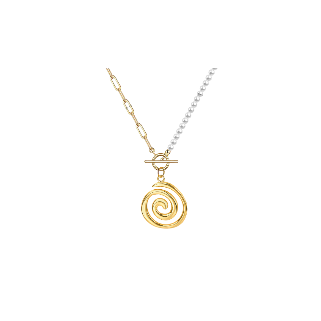 Gargantilla: Mitad cadena de eslabones alargados y mitad hilo de perlas sintéticas de 4 mm, unidas por un cierre de barra y anilla de 12 mm donde cuelga un colgante espiral de 30 mm en acero inoxidable 316L chapado en oro de 18 k. Ajustable (38–43 cm) y hipoalergénica, aporta un contraste entre lo arquitectónico y lo clásico.