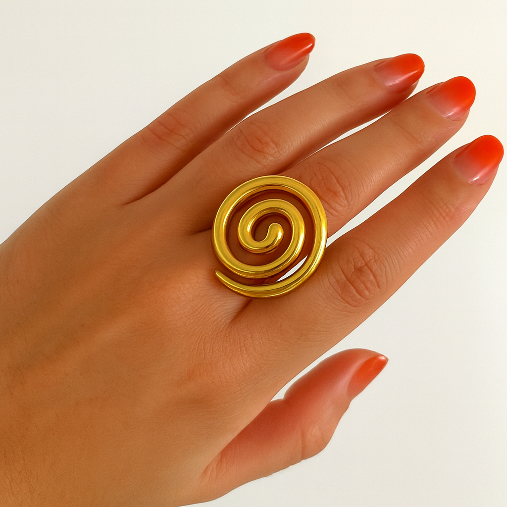 Anillo: Espiral de 15 mm de diámetro con acabado pulido. Disponible únicamente en talla 7 (Ø interior aprox. 17,3 mm / contorno 54–55 mm). Peso: 7 g. Refleja la luz y armoniza con tu gargantilla para un conjunto equilibrado y con movimiento.