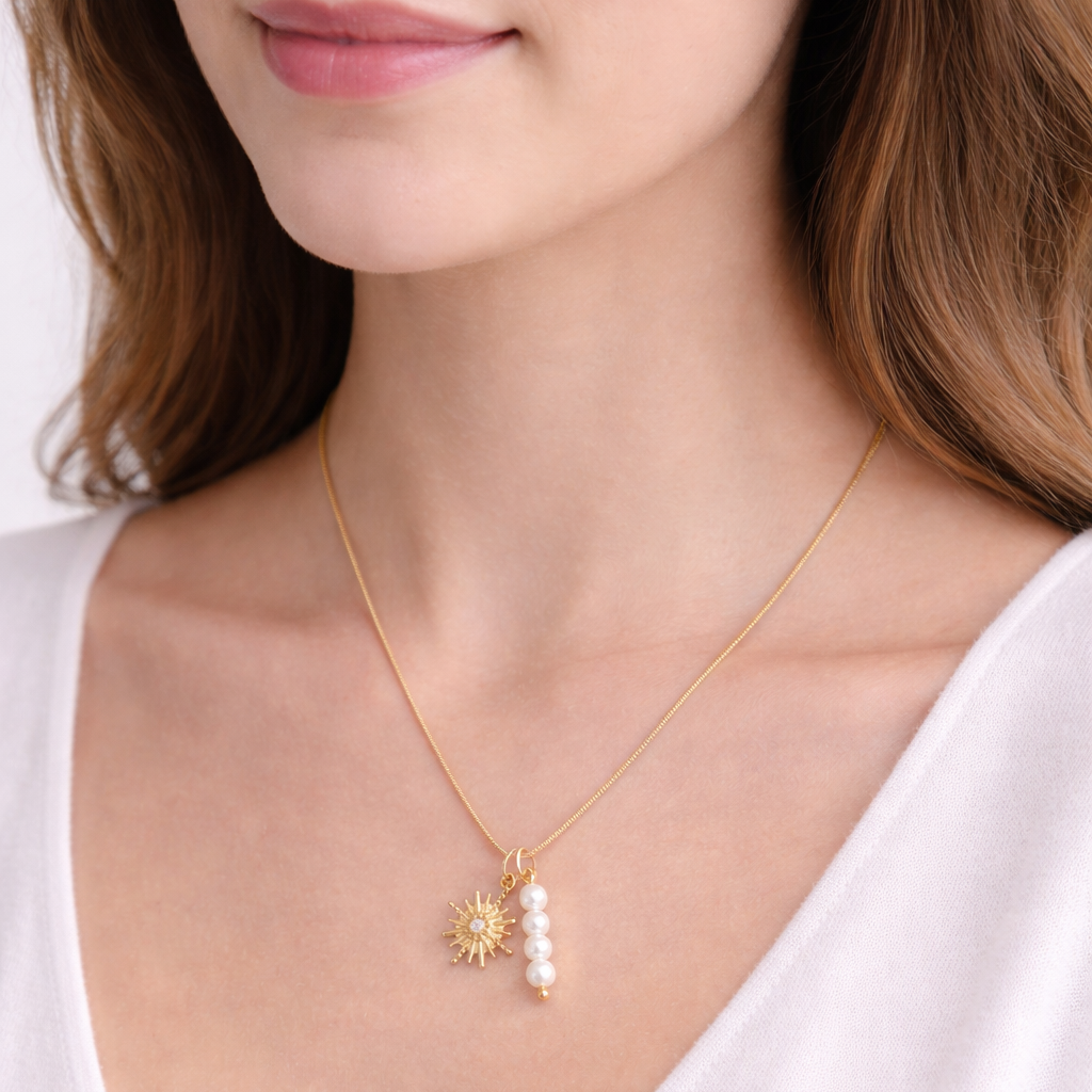 Este collar elegante y sofisticado, llamado Grace, presenta una cadena de serpiente fina de 50 cm de largo con dos encantadores colgantes: una estrella con circonita brillante y 4 perlas sintéticas en vertical. Hecho de acero inoxidable 316 bañado en oro de 18k, este collar es duradero y resistente al desgaste, asegurando su brillo y belleza a lo largo del tiempo. Dale un toque de elegancia a cualquier atuendo con el collar Grace. ¡Haz una declaración de estilo con este joya única y hermosa!