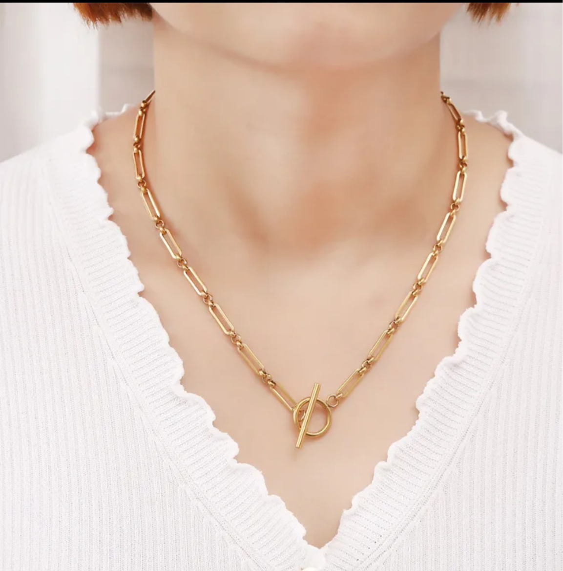 La Versus 18K es la cadena que se adapta a todo. Su diseño de eslabones rectangulares dorados y su cierre frontal T-bar la hacen perfecta para llevar sola, en layering con otros collares o como base para añadir charms y crear tu propio diseño DIY. Una pieza versátil y atemporal que se convertirá en un imprescindible.